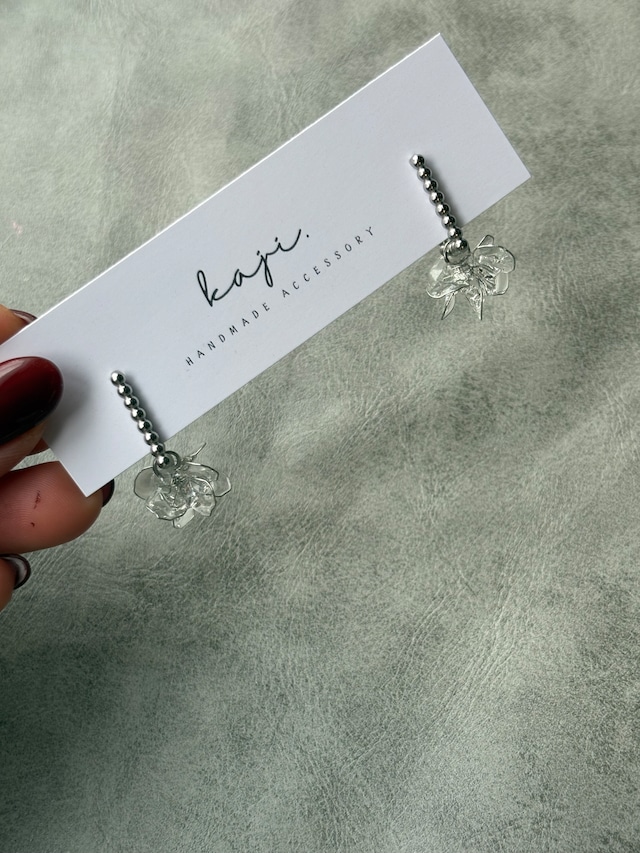 パールとガラスのような透明感のあるお花が特徴のClear Flower Pearl silver 光に当たる度、輝きを放ちながらも軽やかな印象を与えるデザインで、どんなシーンでも存在感たっぷりです! ワイヤーで形取られたお花が重なるデザイン。 アクセサリーとしてはもちろん、インテリアとしても飾りたくなるような魅力を持っています。贈り物としてもおすすめです! ピアスには信頼のサージカルステンレスを使用していますので、金属アレルギーの方でも安心してお使い頂けます。 普段使いはもちろん 卒業、入学なのどの行事にも万能に使えますよ(^^)